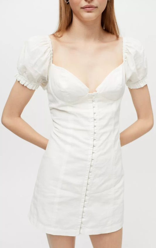 Britney Hook & Eye Mini Dress White Puff Sleeves Ivory Cotton