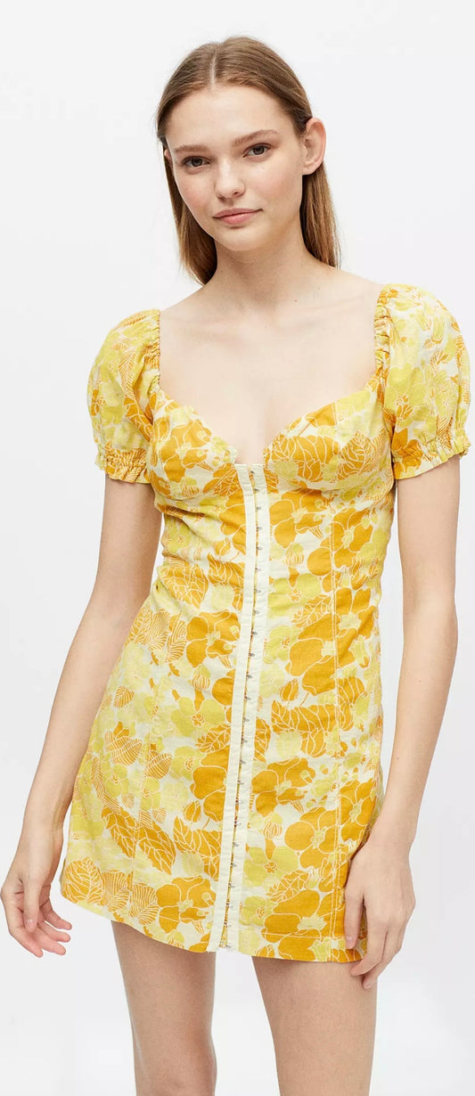 Britney Hook and Eye Mini Dress Yellow Floral Printed Cotton